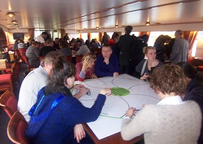Met de boot brainstormen tussen Maastricht en Luik. Inspiratie zoeken in het oude stadsdeel van Maastricht.