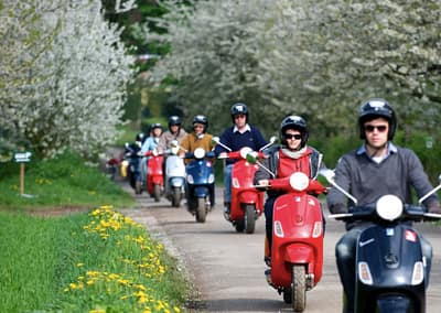 Met de vespa door Haspengouw. Met stops aan het doorkijk kerkje of op de fruitboerderij.